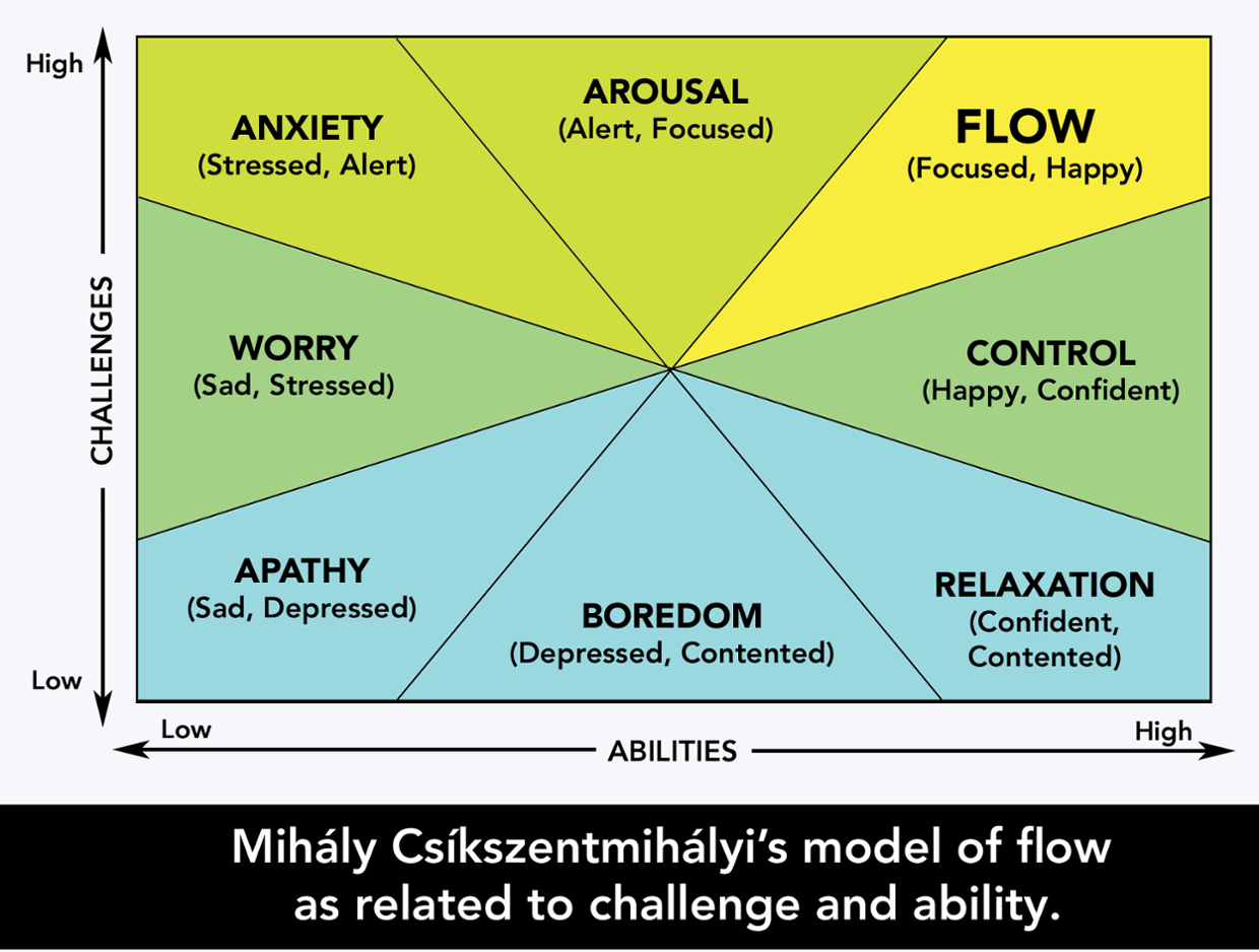 Essentially, any task you perform presents you with a challenge, and depending on your skill level, abilities, or general aptitude for the task your mental state will fall into a particular major category for that task. With the "ideal" mental state being "FLOW."