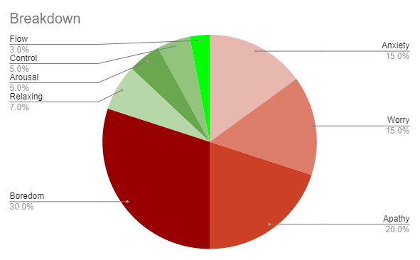 Unfortunately, this graphic has one flaw, which is that it implies that all these emotions are granted equally at a roughly 12.5% split each (100/8), but I think a "real" breakdown, at least in terms of averages, is more like this: